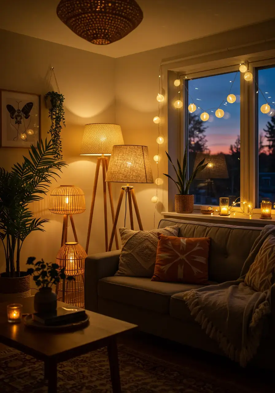 Layered and warm lighting creates a relaxing, intimate atmosphere, perfect for unwinding and complementing the bohemian aesthetic.