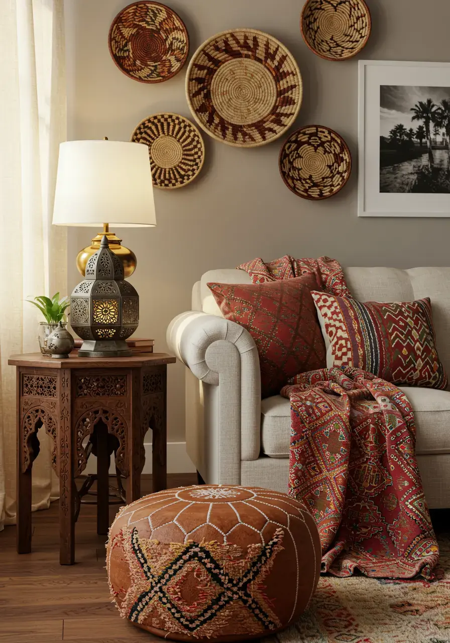 - Display handcrafted items such as African baskets, Middle Eastern lanterns, or carved wooden objects from Bali.