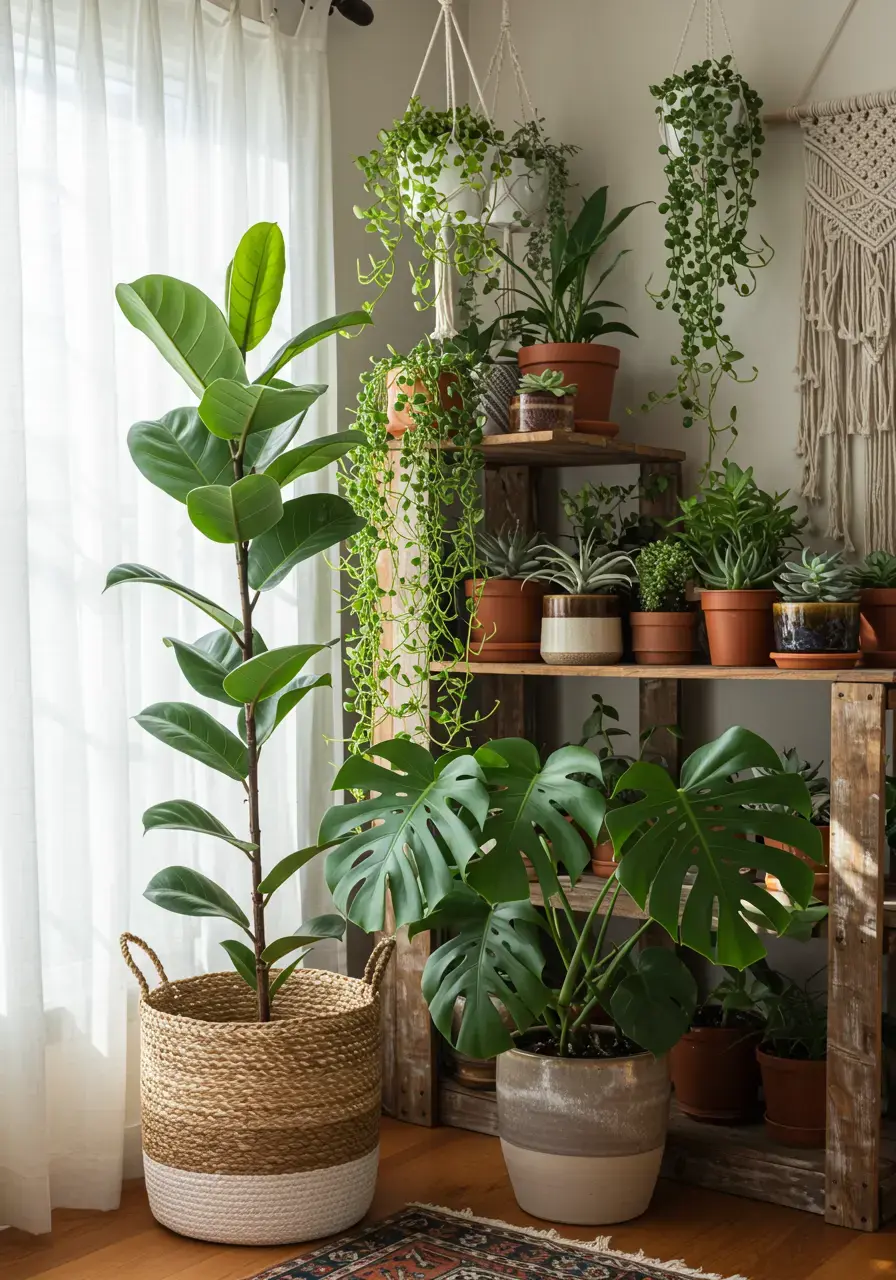 - Group smaller plants on shelves, coffee tables, or windowsills to create mini indoor gardens.