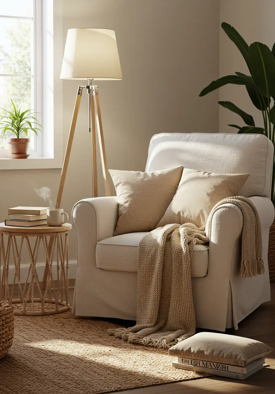 - Ensure good lighting with a floor lamp and have a small side table for books and a warm drink.