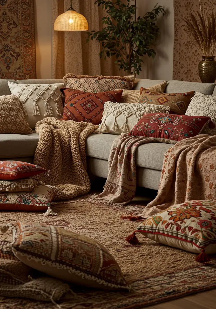 - Pile up a variety of decorative pillows with unique patterns, macrame details, or ethnic prints.