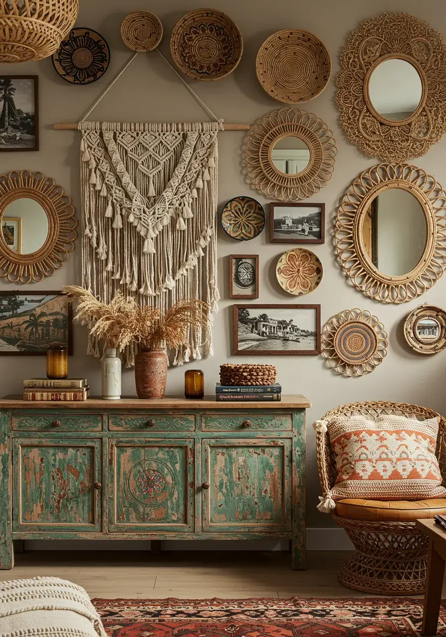 - Create a gallery wall with a mix of framed art, travel photos, and woven plates or baskets.