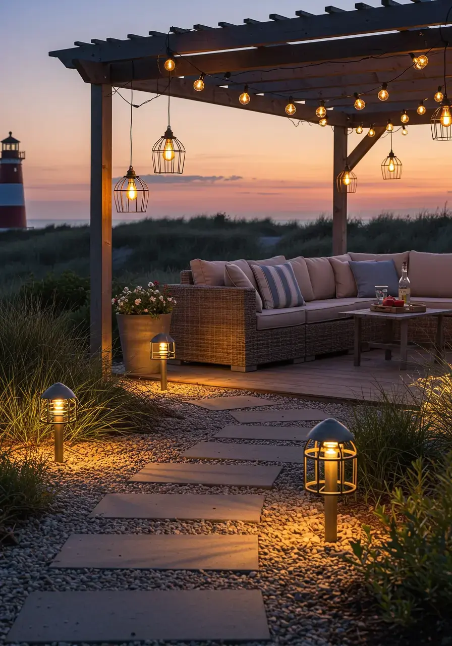 Coastal-inspired lighting enhances the evening ambiance and extends the usability of your garden, adding a warm, inviting glow that complements the theme and provides necessary illumination.