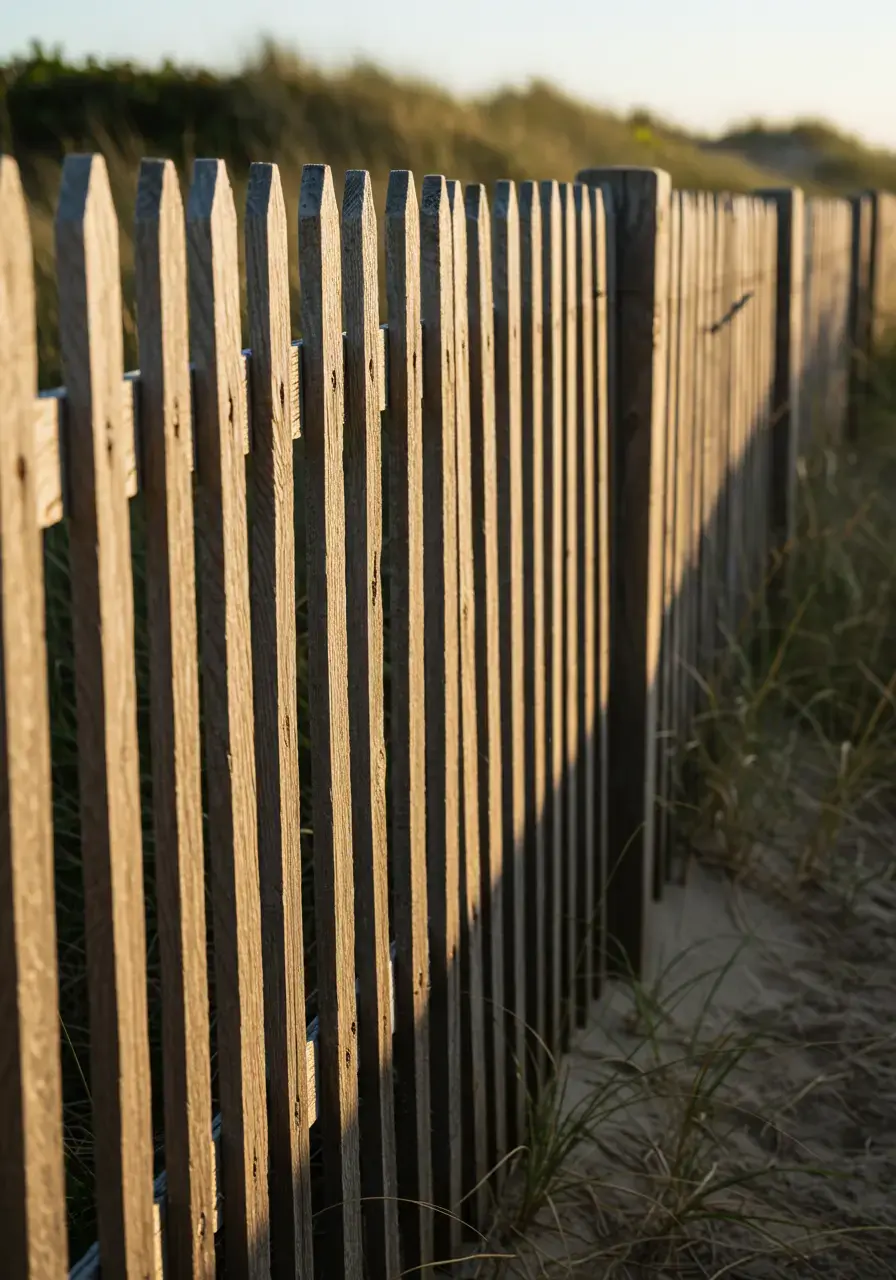 Weathered wood fencing adds a rustic, time-worn look that aligns with the natural aging process seen along the coast, providing privacy and structure with authentic character.