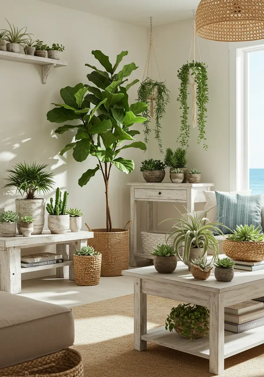 Greenery introduces life, freshness, and organic texture to the space. It connects the indoor environment to nature, enhancing the calming and restorative atmosphere of a coastal living room while adding subtle color.