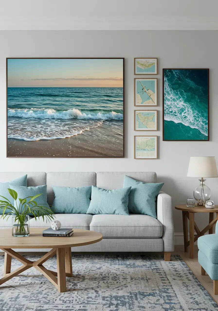 • Create a gallery wall with smaller pieces featuring marine life, sailboats, or topographical maps of coastal areas.