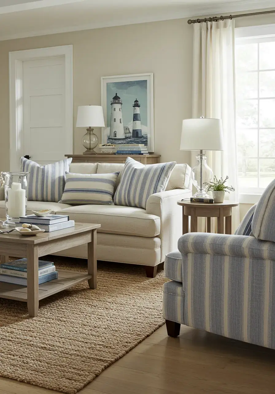 Stripes just have that classic, timeless nautical feel, don’t they? They remind me of beach umbrellas, lighthouse towers, and classic sailor shirts. Whenever I add a striped element to my coastal living room, it instantly pulls the whole look together, adding a crisp, clean line that balances out the more organic shapes. It’s a simple pattern, yet incredibly effective for creating that cohesive coastal vibe. I often lean towards subtle, wider stripes, as they feel a bit more relaxed and less ‘busy’ than very thin ones.