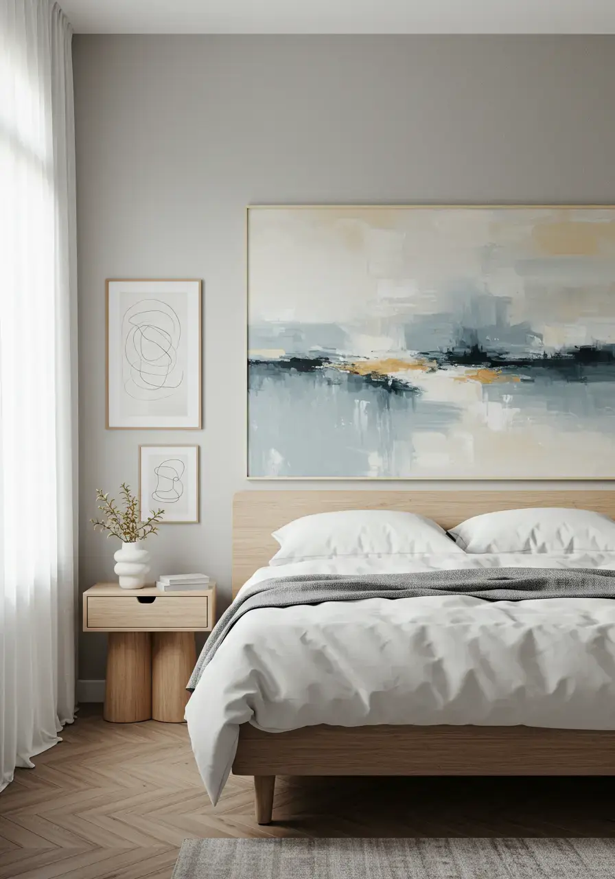 • Create a small, curated gallery wall with 2-3 complementary pieces of abstract or minimalist art.