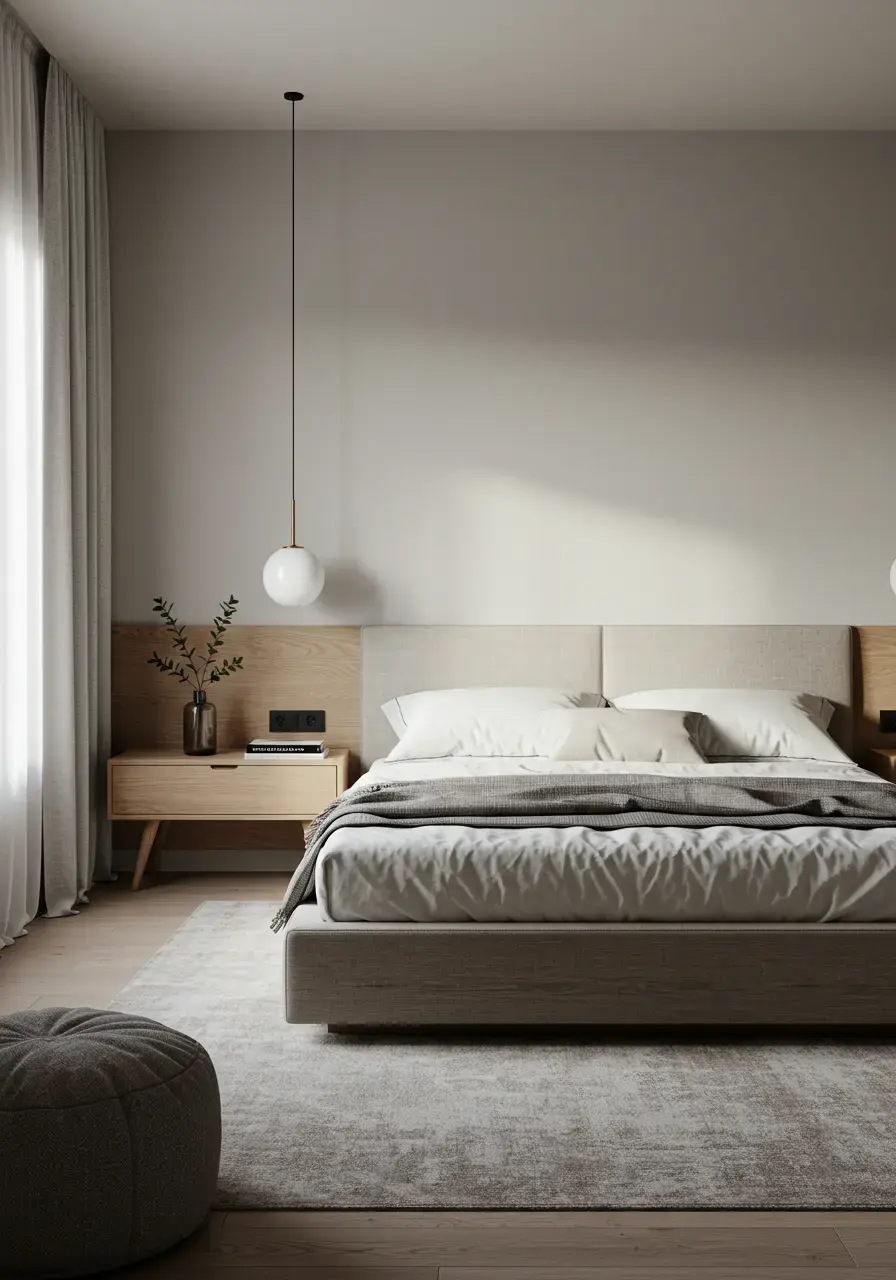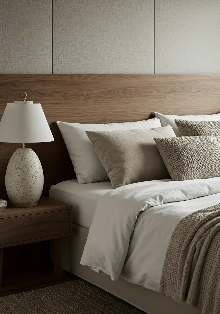 • Introduce natural materials like a wooden headboard, a woven rug, or a ceramic lamp base.