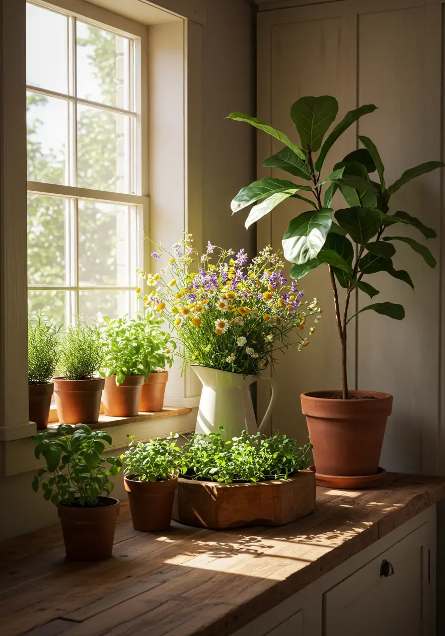 There’s something incredibly refreshing about bringing a little bit of the outdoors in. For me, greenery is the final touch that makes a farmhouse kitchen feel truly alive and connected to nature. Even a small potted herb can make a huge difference in brightening up the space and adding a touch of rustic charm.