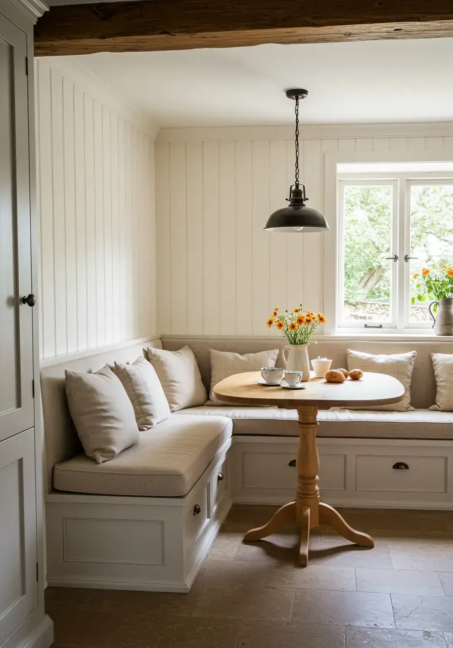 • Incorporate a built-in banquette or a small bench with comfortable cushions.