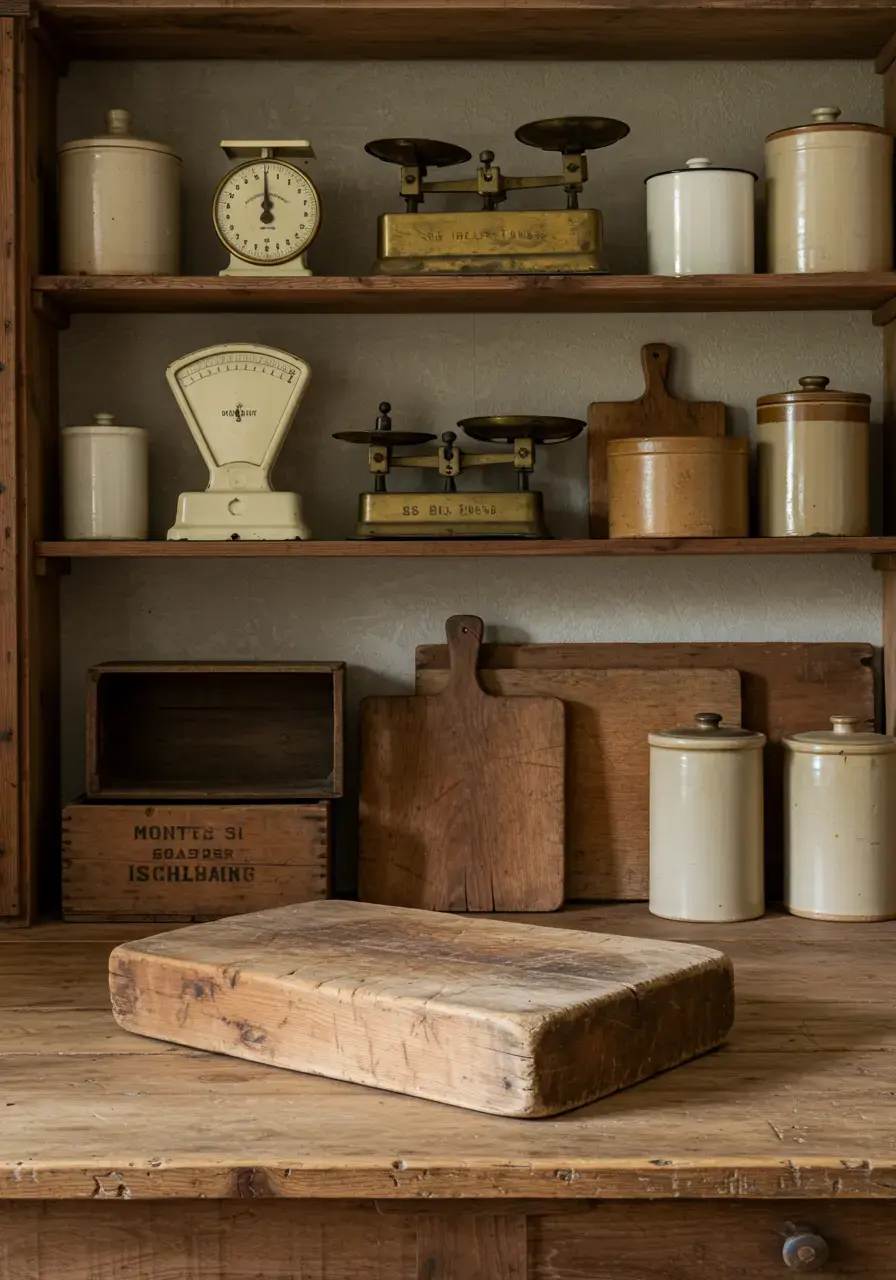 • Look for vintage scales, wooden crates, old bread boards, enamelware, or stoneware crocks.