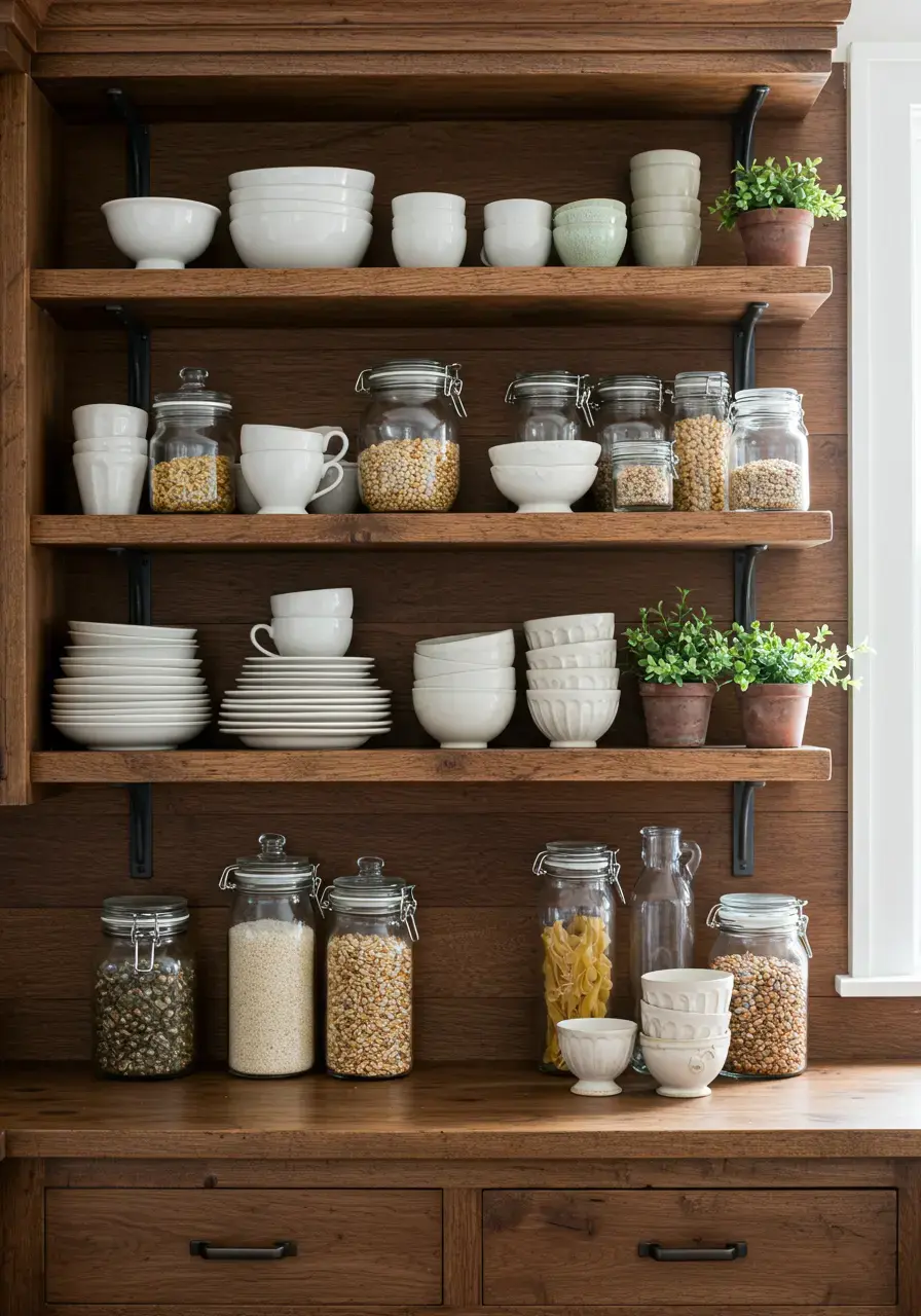 - Style your shelves with a mix of everyday dishes, glass jars filled with pantry staples, and small decorative items like ceramic bowls or plants.