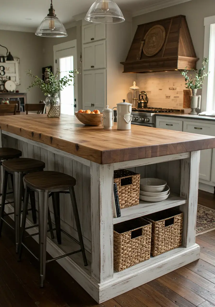 - Look for an island with open shelving for displaying baskets or cookbooks, or one with distressed wood paneling.