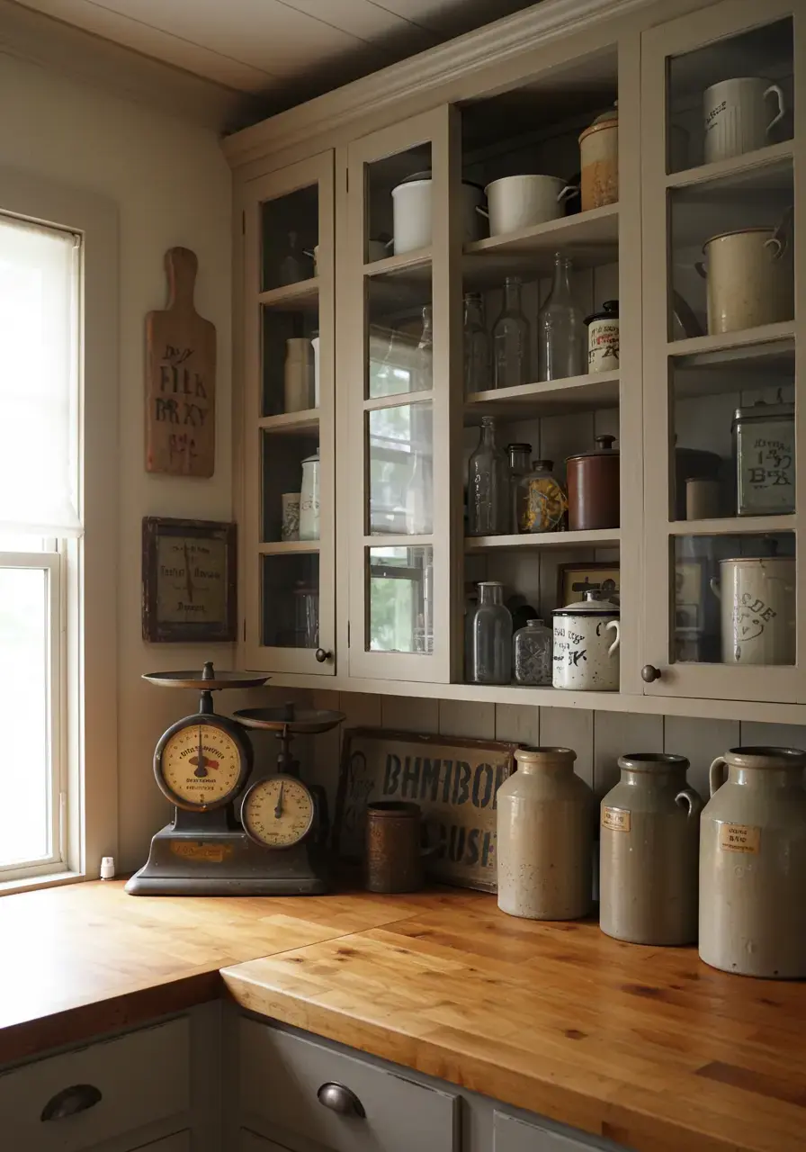 - Hunt for vintage kitchen tools, enamelware, old crocks, or distressed wooden signs.