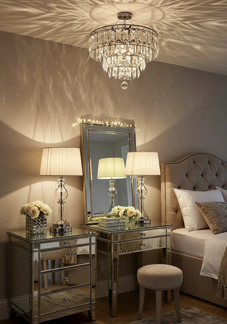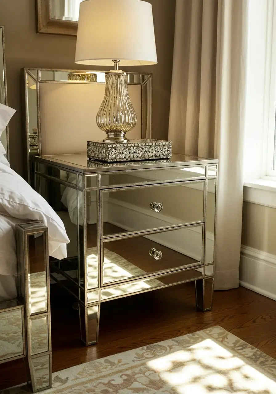 Mirrored furniture reflects light, creates a sense of spaciousness, and adds a touch of vintage Hollywood glamour to your bedroom.