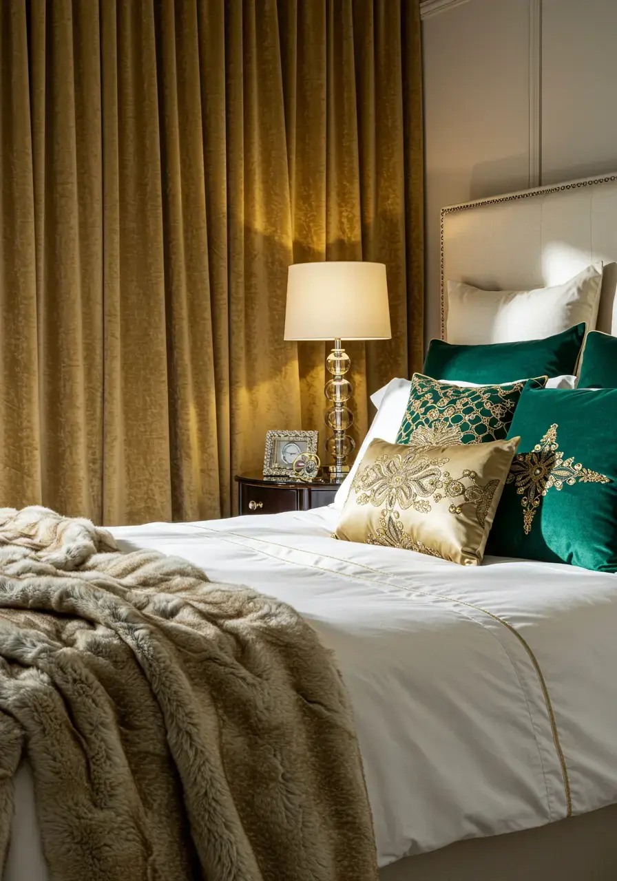 - Add decorative scatter pillows in rich fabrics with glamorous embellishments.