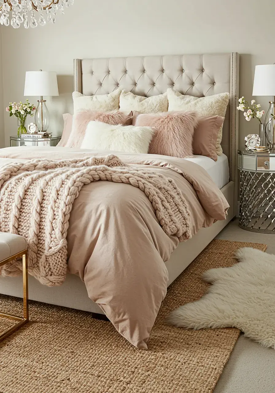 Layering isn’t just for clothes; it’s a fantastic way to create a cozy and inviting feel in your glam bedroom. By combining different textures, you add depth and visual interest, making the room feel more rich and layered. Think about the feeling of sinking into layers of soft throws and pillows!