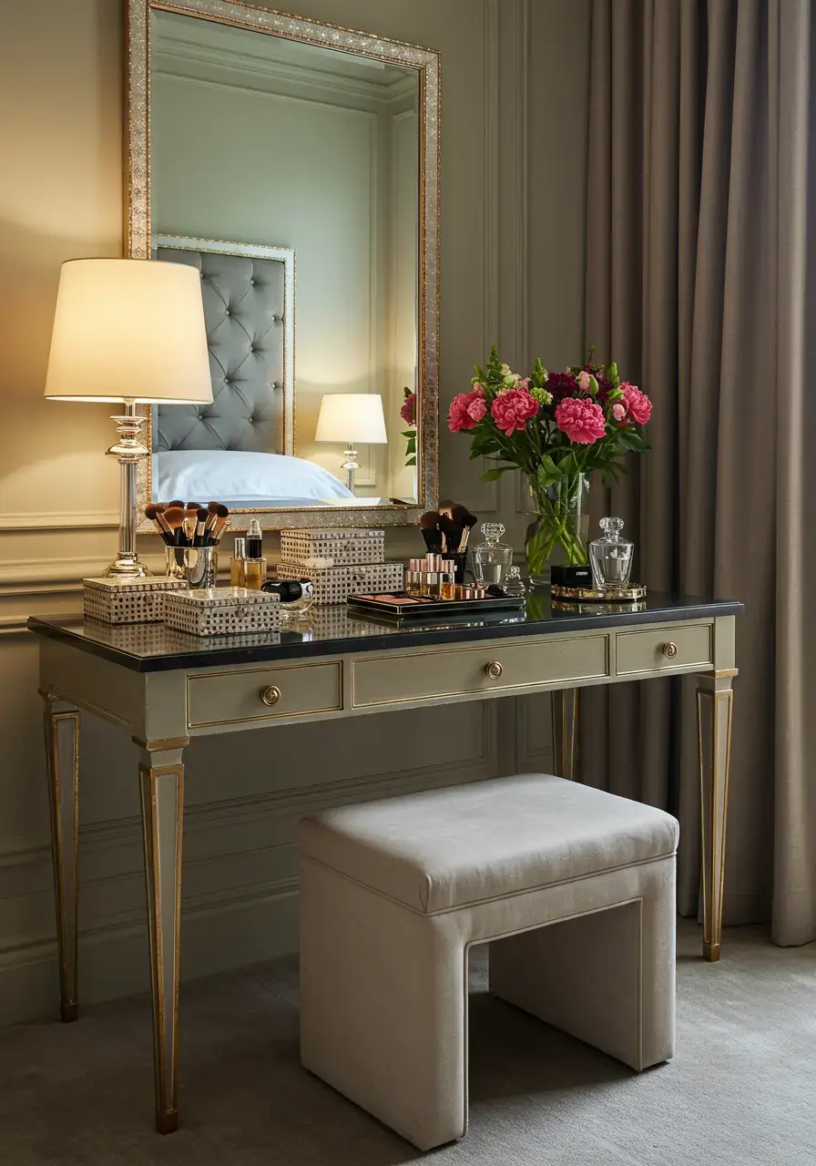 - Choose a stylish vanity table with a mirror and comfortable stool.