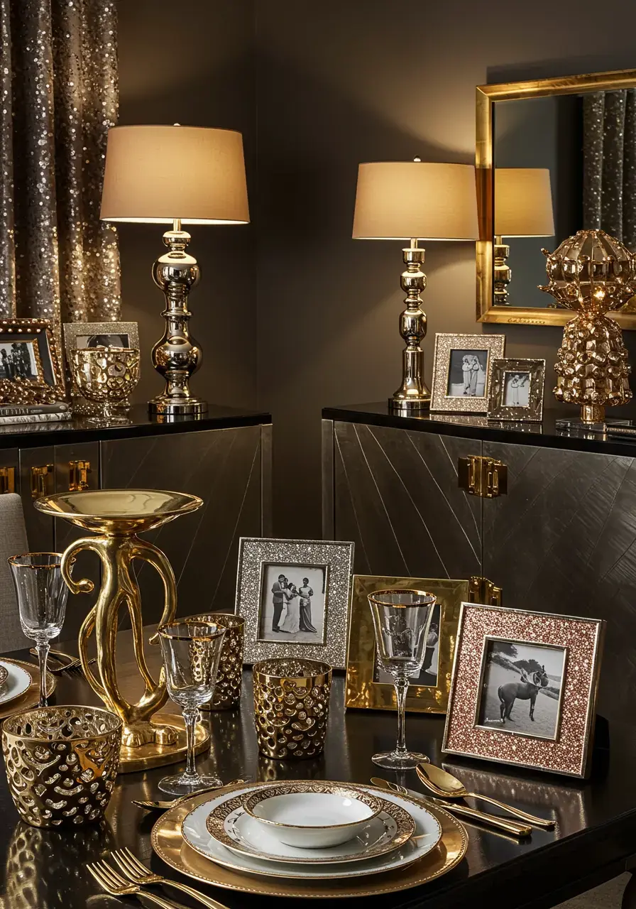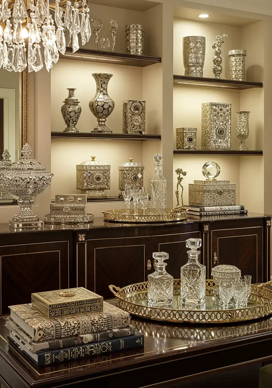 - Adorn surfaces with decorative objects like brass sculptures, polished silver bowls, or gold-rimmed glassware.