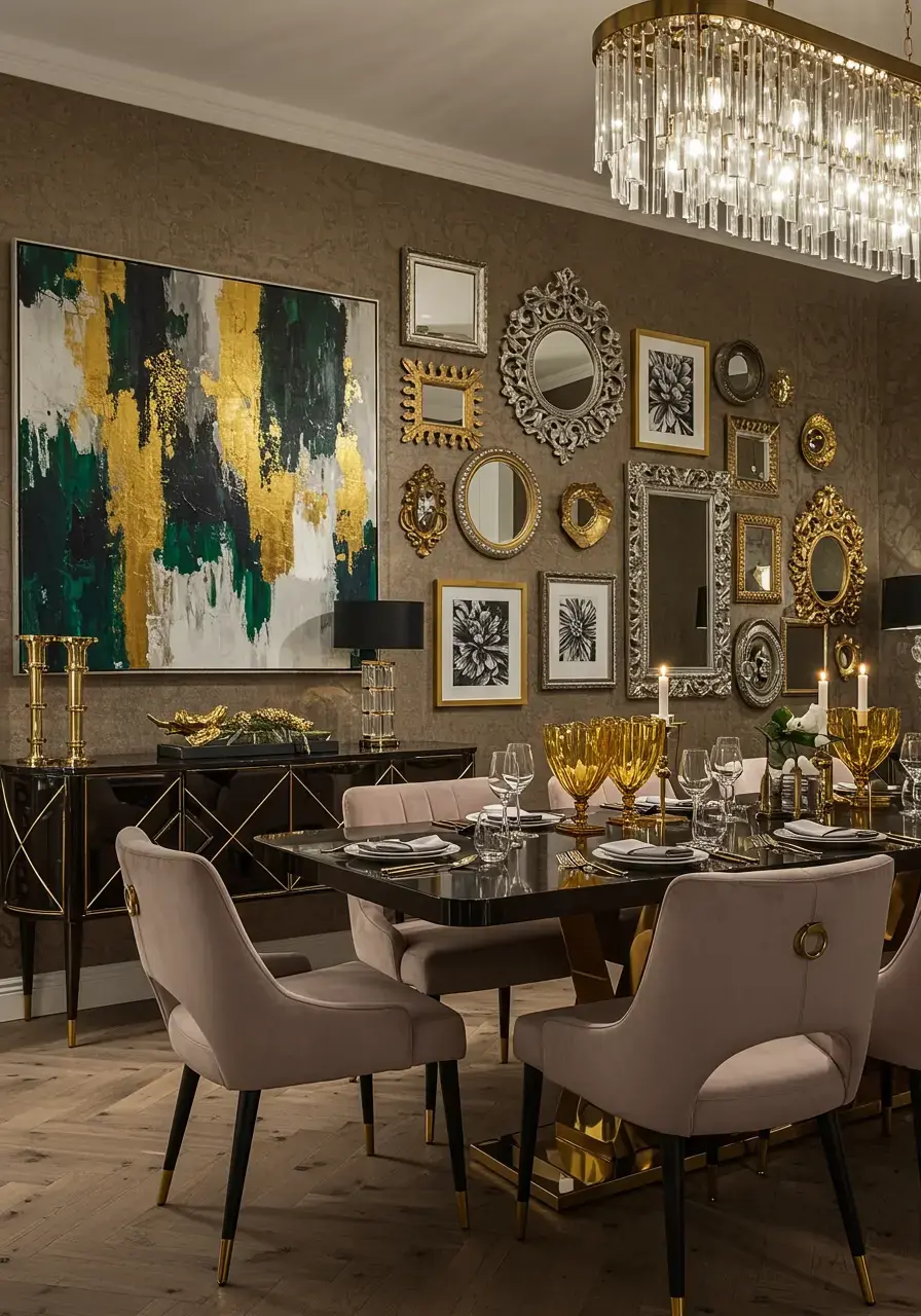 Thoughtfully chosen wall decor adds personality, color, and texture, making the room feel complete and visually appealing. It elevates the overall aesthetic of your glam dining room.