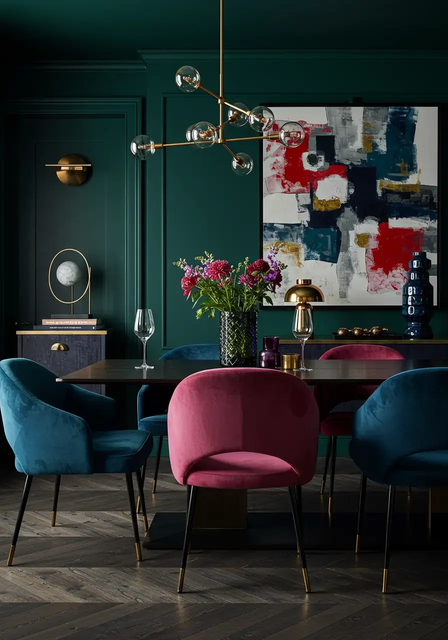 Bold colors create a sense of drama and sophistication, making the dining room feel lavish and impactful. They provide a strong foundation for the glamorous elements.