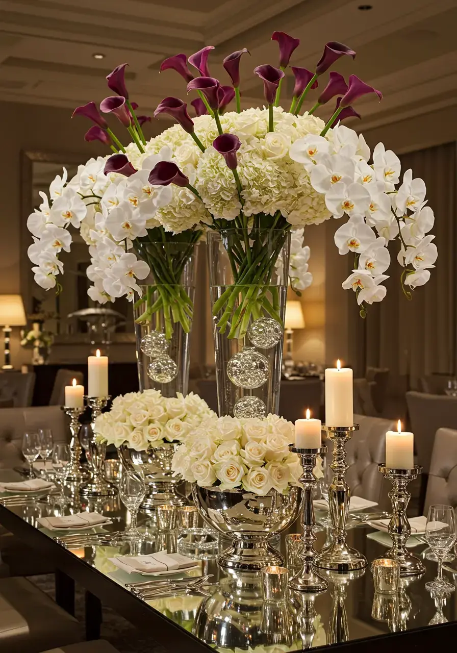 - Use tall, slender vases with cascading orchids or dramatic calla lilies for height and grace.