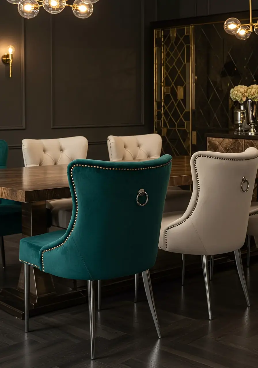 - Choose dining chairs upholstered in rich velvet, tufted leather, or sleek faux fur for a touch of luxury.