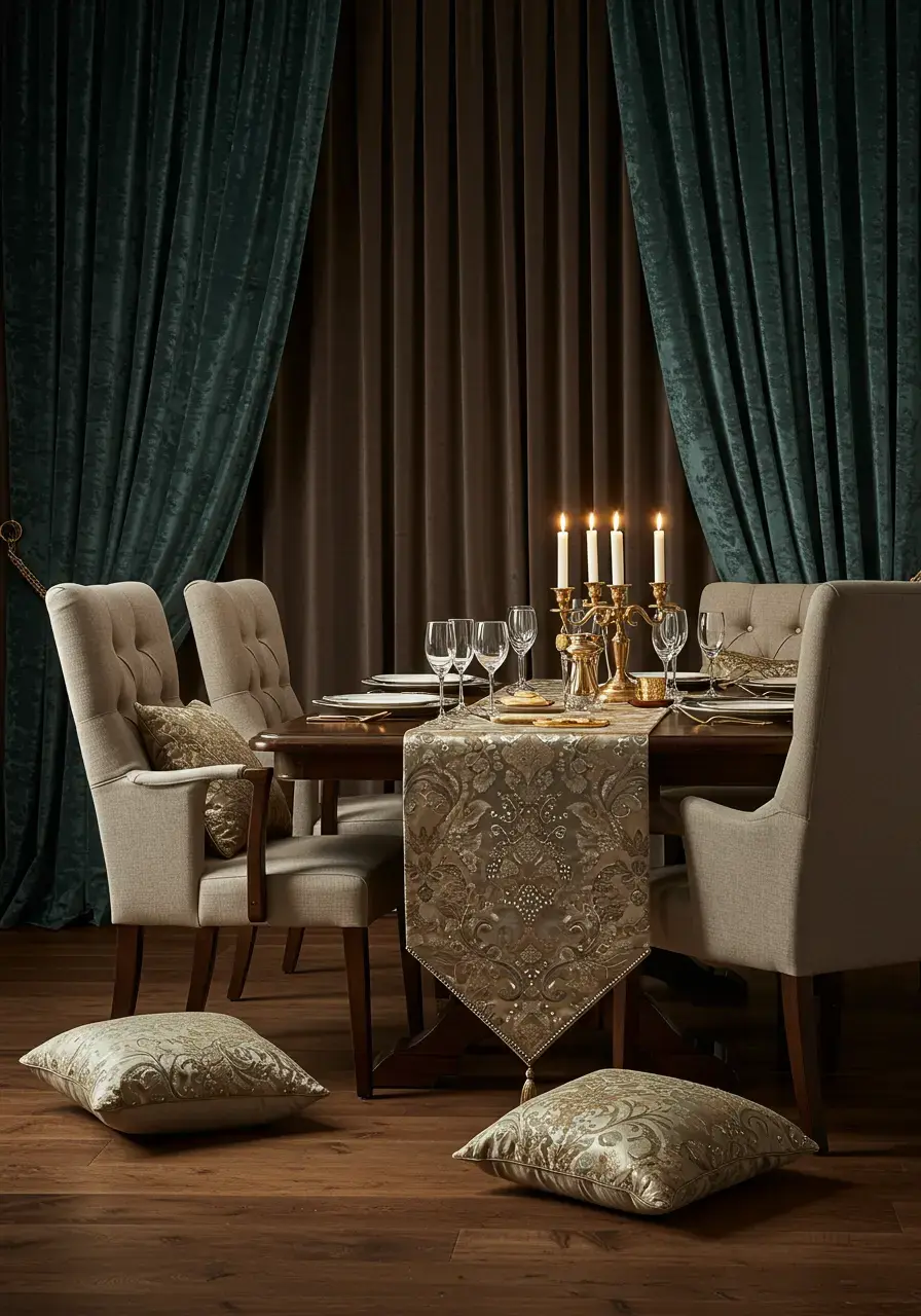 - Use a high-quality table runner in silk brocade, satin, or sequined fabric.