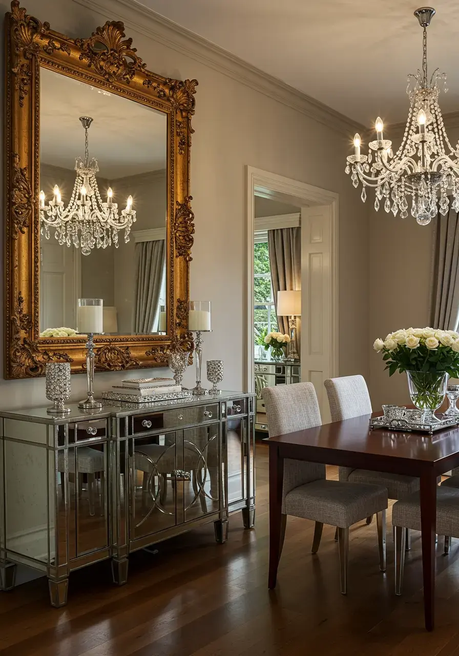 - Use mirrored furniture pieces, such as a mirrored buffet or console table.