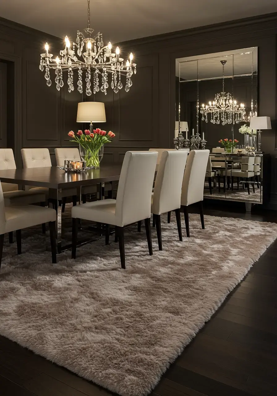 A rug isn’t just something to cover the floor; it’s an anchor that defines a space, adds warmth, and introduces another layer of texture and color. In a glam dining room, a statement rug can quietly command attention, pulling the whole room together. I once helped a client find the perfect faux fur rug, and it completely transformed the feel of their rather minimalist dining area into something truly inviting and refined.