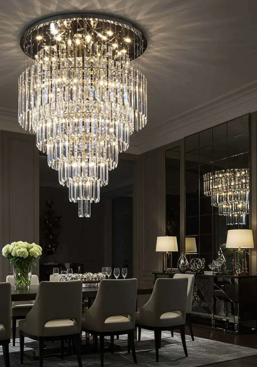 - Install a grand crystal chandelier with multiple tiers and reflective facets for maximum sparkle.