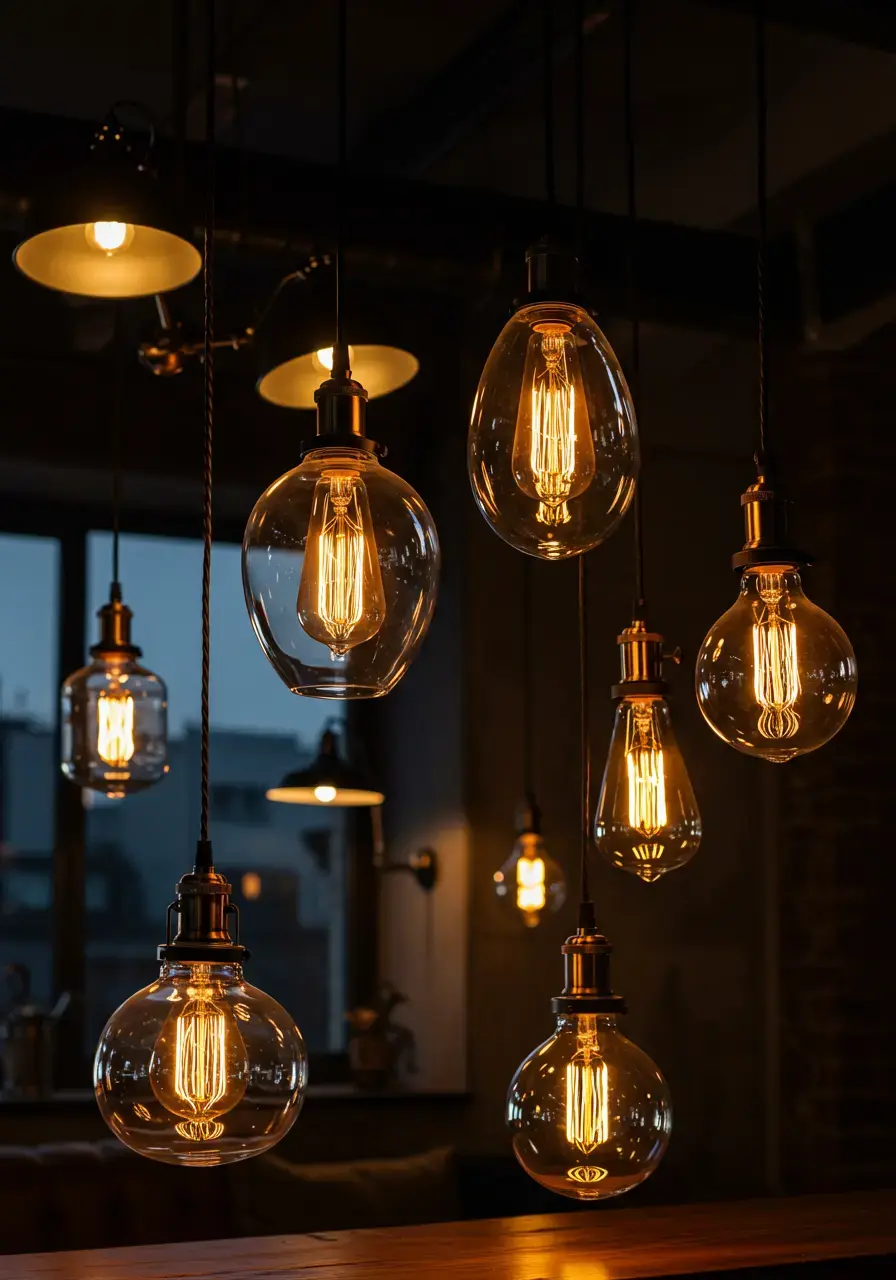 Edison bulbs provide a warm, inviting glow that enhances the vintage industrial aesthetic. Their exposed filaments are a key visual element, adding authenticity and character to the lighting scheme.