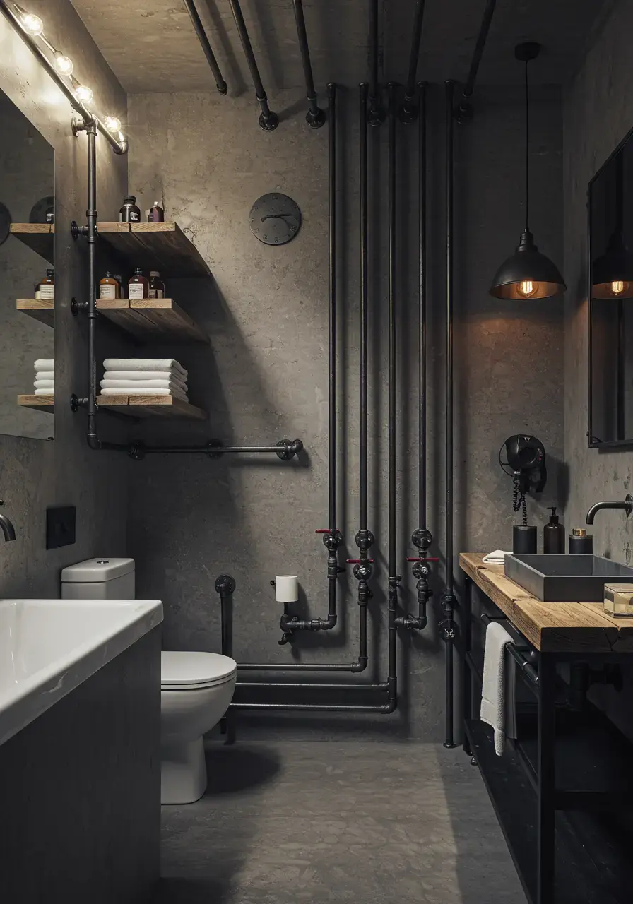 - Incorporate pipe-style shelving or towel racks to echo the exposed pipe aesthetic throughout the room.