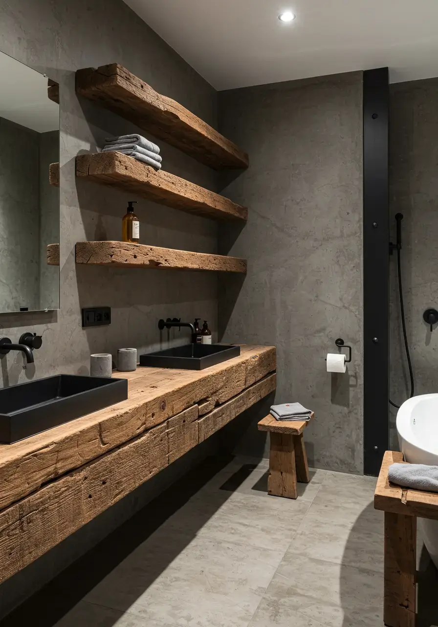 Reclaimed wood shelving adds essential warmth and organic texture to an industrial bathroom, balancing hard surfaces. It brings a sense of history, character, and can provide practical storage.