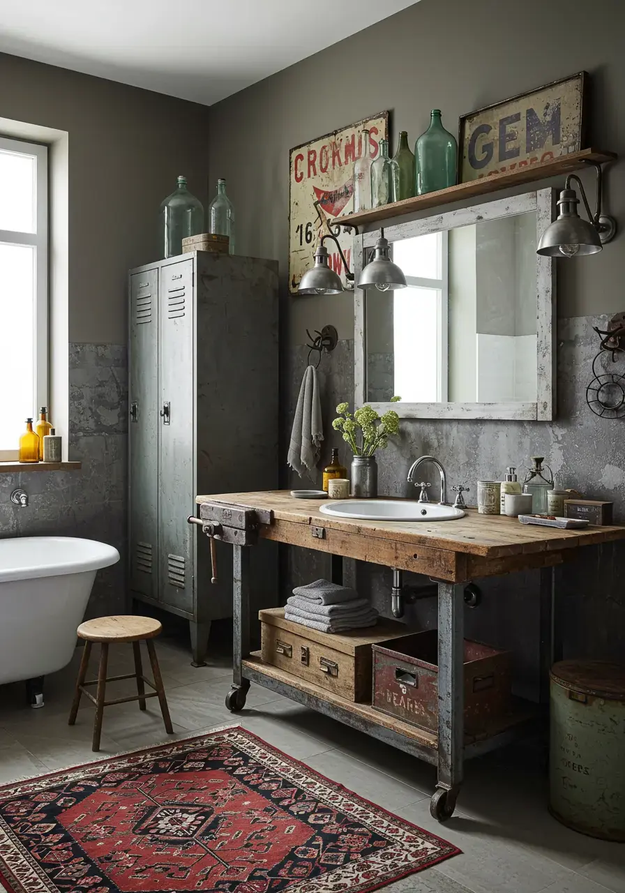- Look for old factory carts or workbenches to repurpose as vanity bases or storage units.