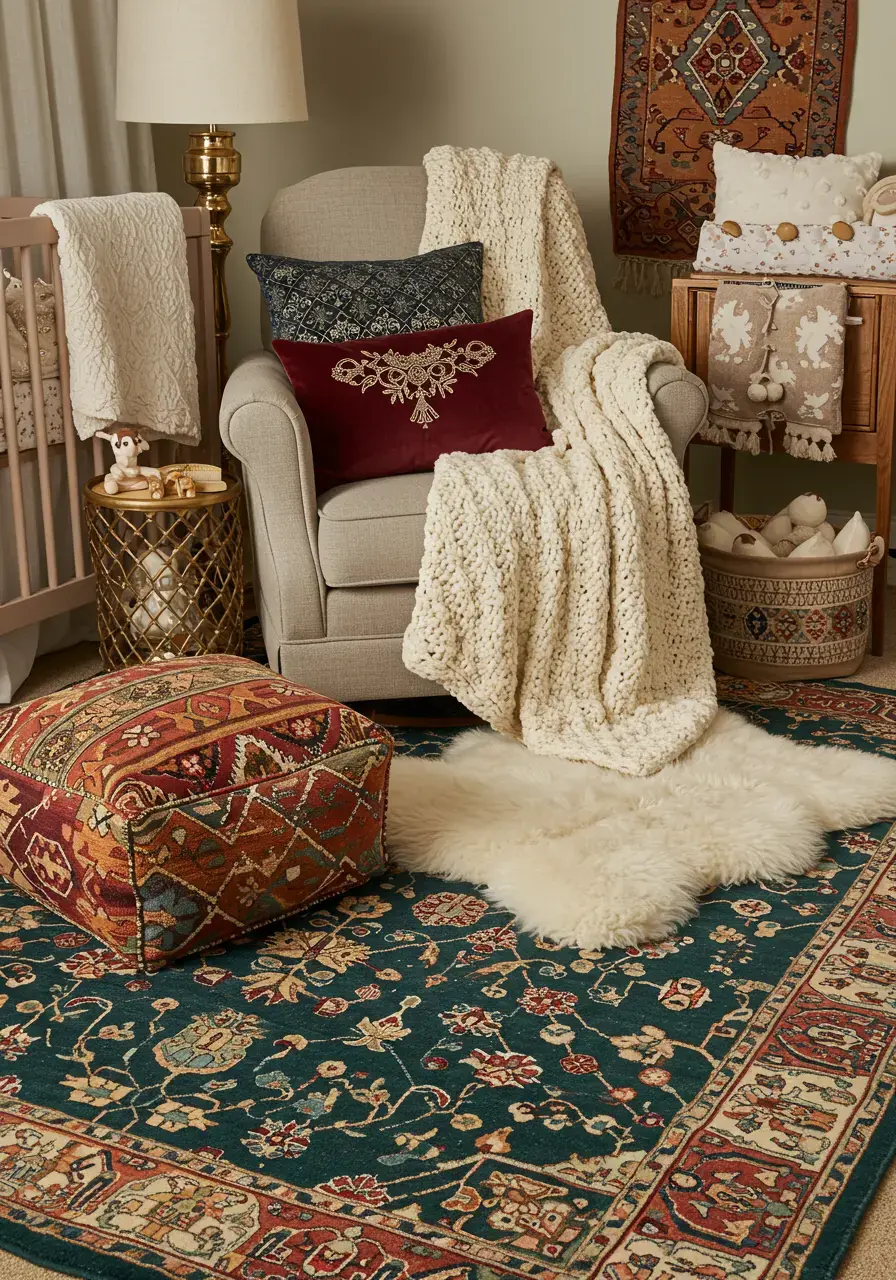 Layering textiles is probably my favorite part of any design project. It’s like dressing a room in cozy, beautiful clothes. For a maximalist nursery, this means more than just a rug. Think different textures, patterns, and weights. I remember combining a fluffy sheepskin rug with a Kilim-inspired floor pillow, and then adding a chunky knitted throw over the glider. The result was incredibly inviting and soft – perfect for snuggles. It brings so much warmth and tactile interest.