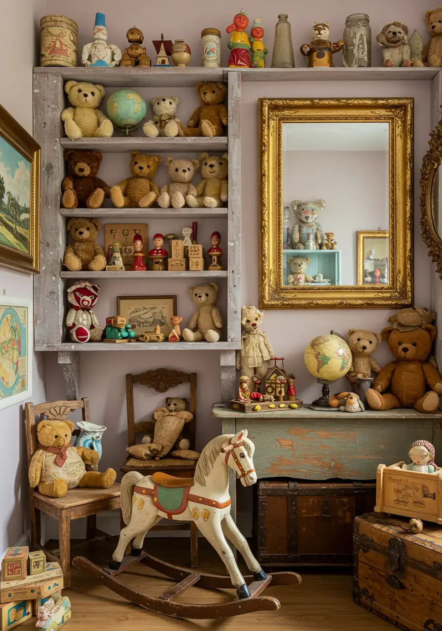 - Hunt for vintage toys like wooden blocks, classic teddy bears, or old children’s books to display on shelves.