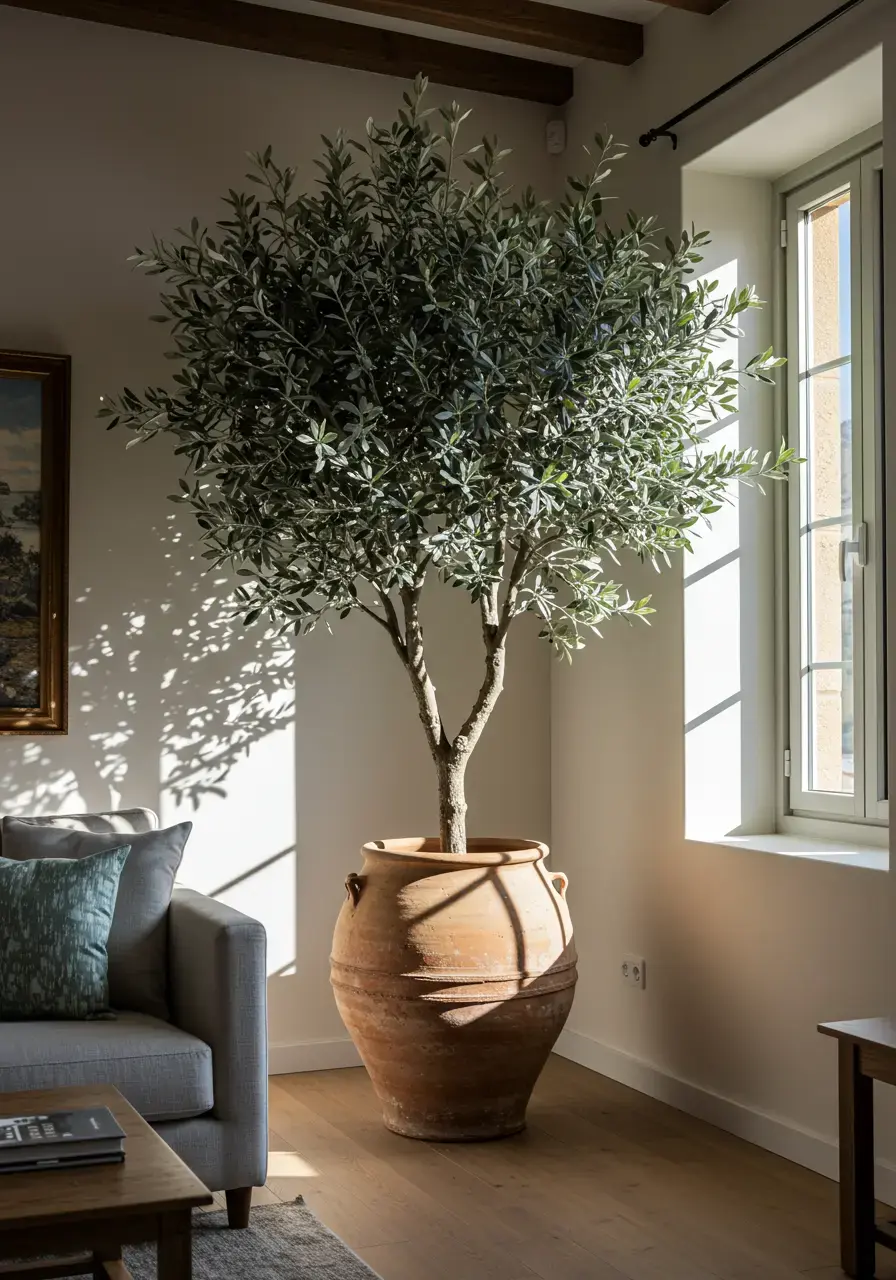 Olive trees bring authentic greenery and a strong visual link to the Mediterranean landscape indoors. They add life, freshness, and a touch of natural elegance to the space.