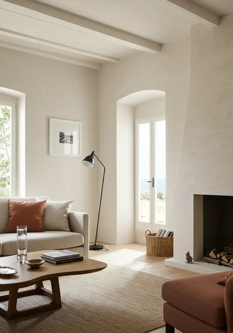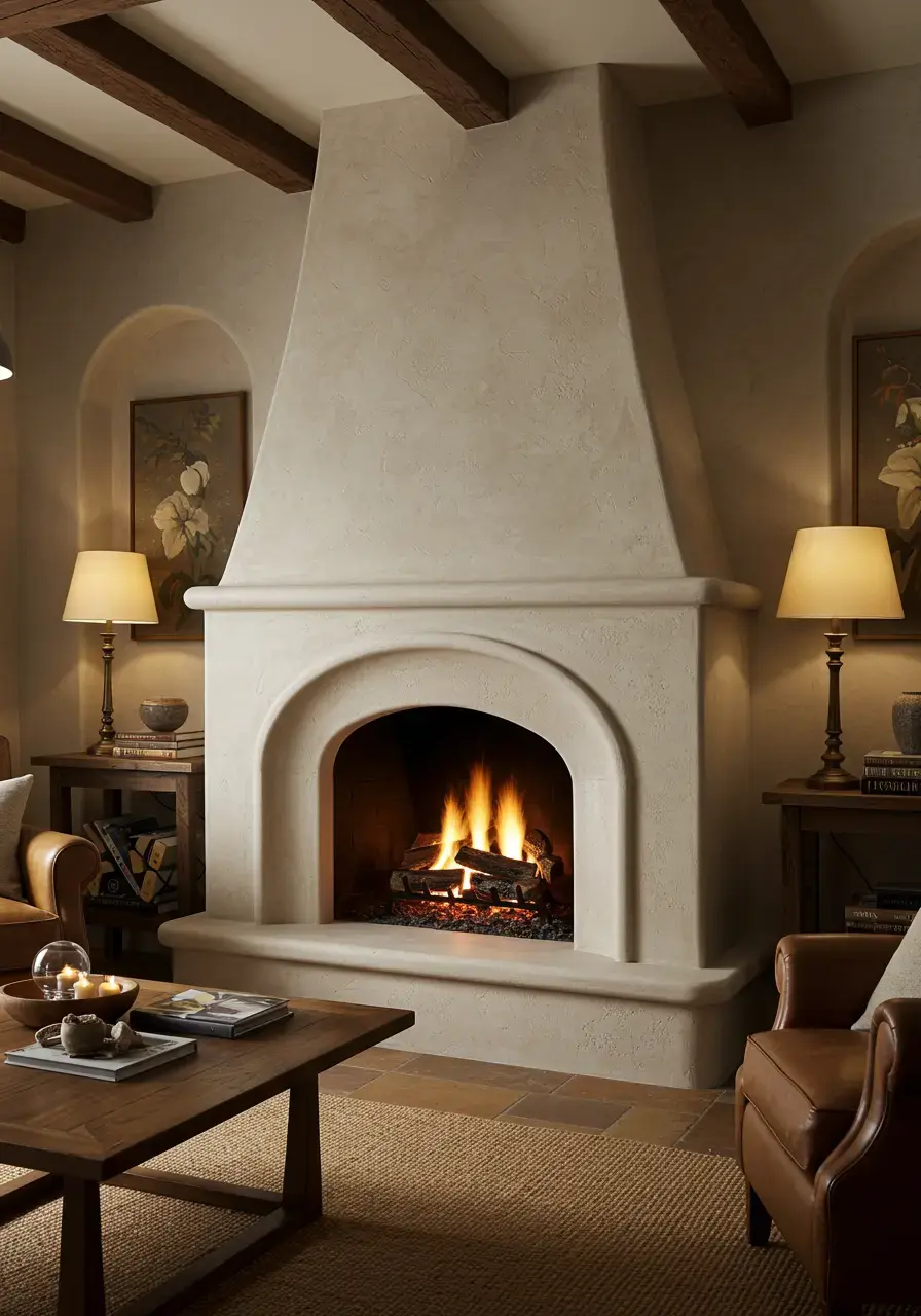 A plastered fireplace creates a soft, organic focal point that feels authentic to Mediterranean style. The texture adds visual interest and a sense of timelessness.