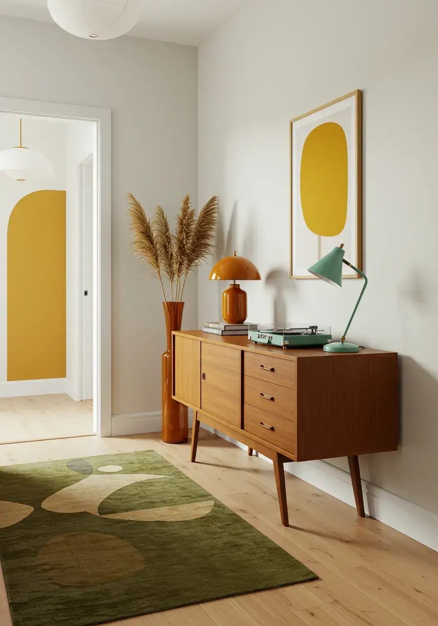 Bold wall decor serves as an immediate visual statement, adding character, depth, and a clear stylistic identity to the hallway. It provides an opportunity for artistic expression and reinforces the mid-century aesthetic.