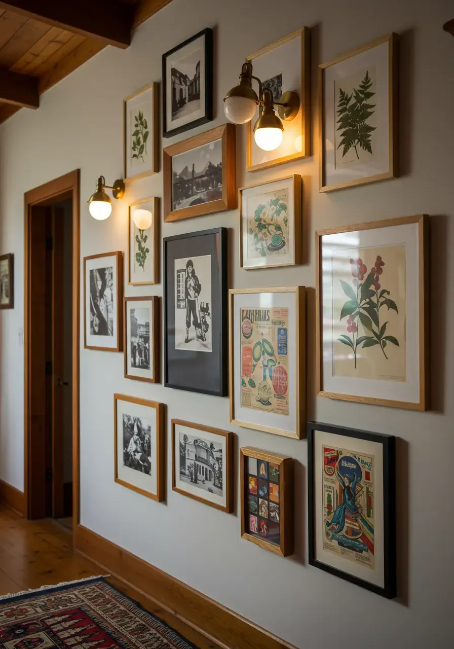 - Include a mix of abstract art, vintage posters, botanical prints, and personal photos.