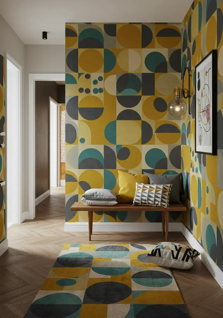 - Choose wallpaper with repeating abstract geometric shapes, circles, or mod patterns for an accent wall.