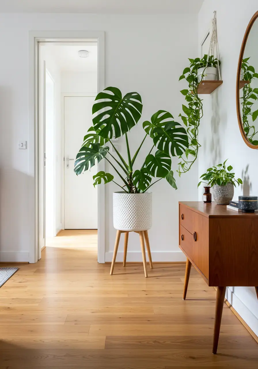 - Place a large, sculptural plant like a Monstera, Fiddle Leaf Fig, or Snake Plant in a stylish pot (ceramic or terra cotta) at the end of a hallway or next to a console.
