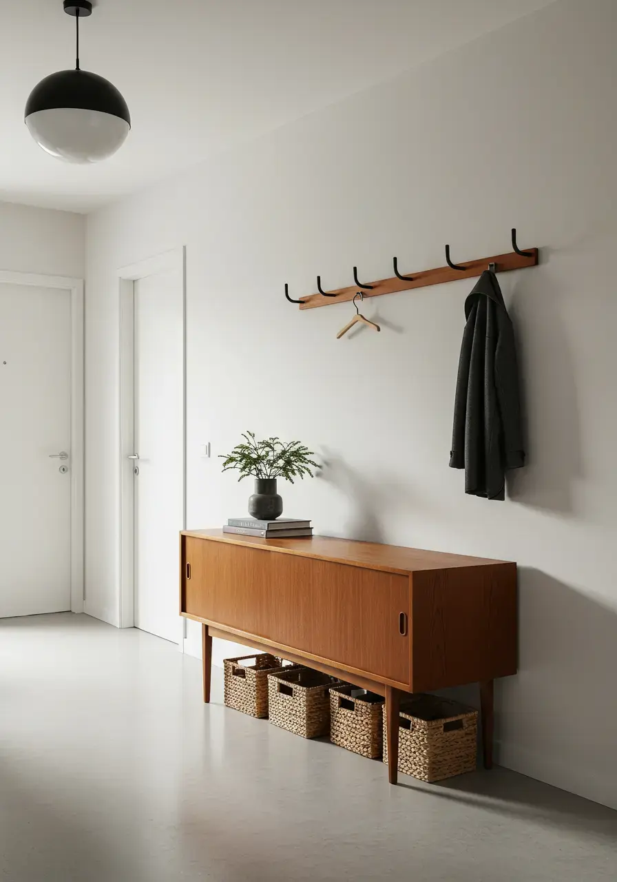 - Install closed cabinetry or a shallow mid-century modern credenza for hidden storage.