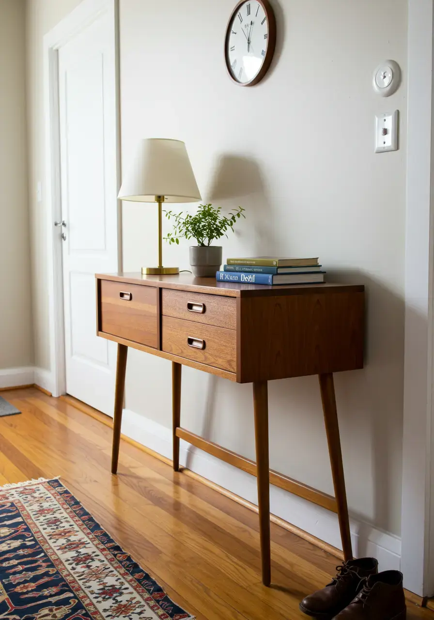 A vintage console table provides practical surface area for daily essentials while also grounding the space and establishing a strong mid-century presence through its design and materials, reflecting authenticity and charm.