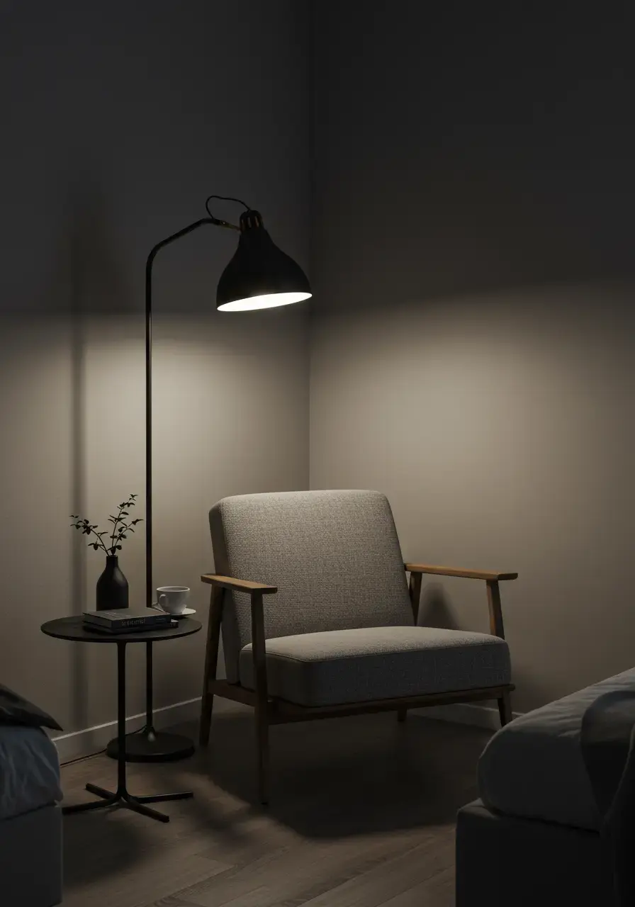 - Add a floor lamp with warm lighting for reading.