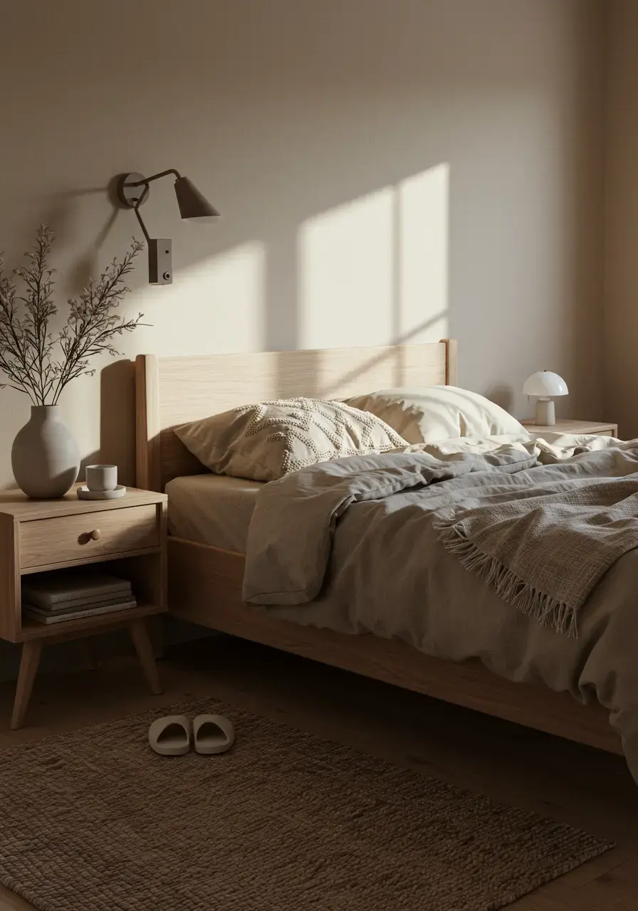 Bringing a bit of the outside in instantly adds warmth and a sense of peace to any space, and a minimalist bedroom is no exception. Think about materials like wood, stone, cotton, linen, and wool. These textures and tones connect us to nature and add depth without adding visual clutter. Even something as simple as a wooden tray on your nightstand or a linen duvet cover can make a big difference.