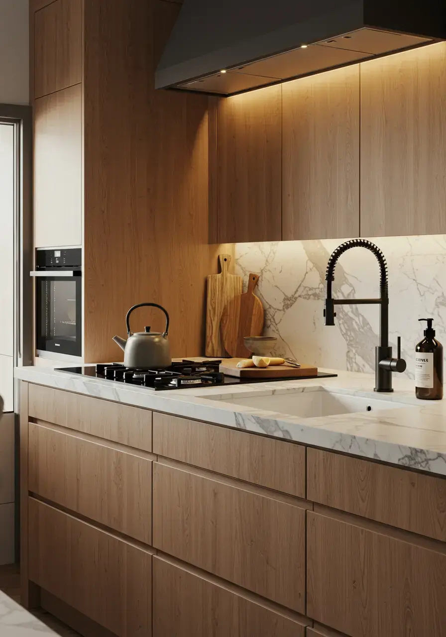Strategic lighting enhances functionality, creates ambiance, and highlights the clean lines and textures of your minimalist kitchen. It can make a space feel brighter, more inviting, and visually expansive.