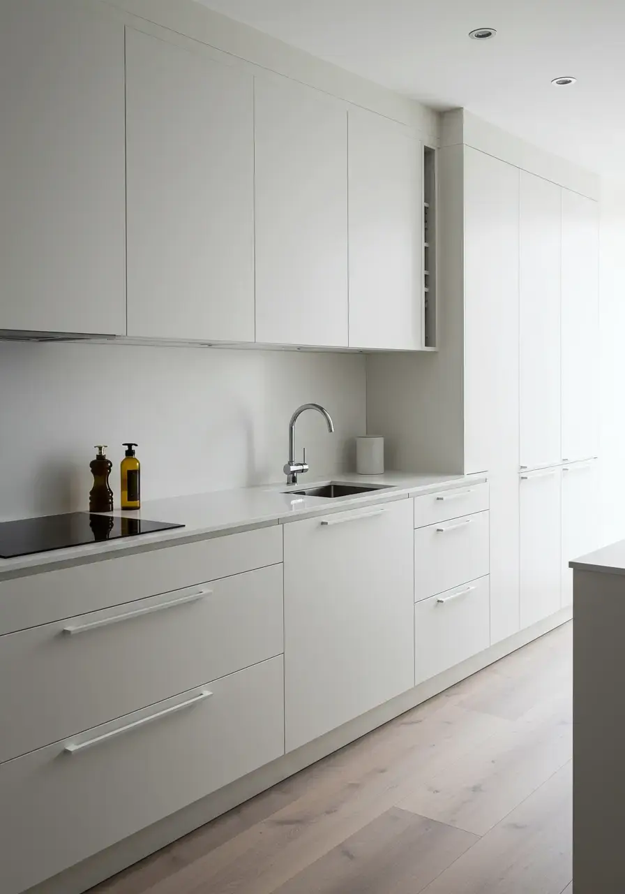 Handleless cabinets create a streamlined, uninterrupted surface, contributing significantly to a clean, cohesive, and sophisticated minimalist aesthetic. They also make cleaning much easier!